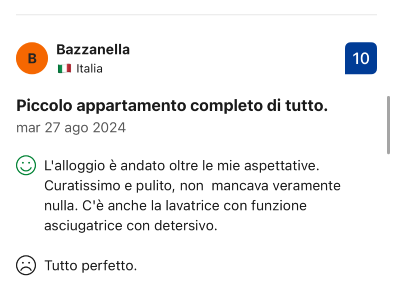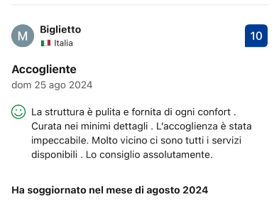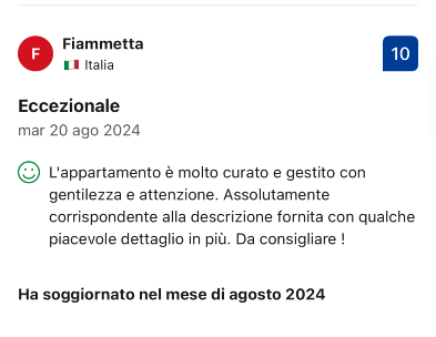 ECCELLENTE In base a 24 recensioni Pubblicato su Giorgia23/08/2021Verificata ☺Appartamento bellissimo, nuovo e pulitissimo, letto fantastico!Pubblicato su Thomas26/06/2021Verificata Modernes und schönes Appartement ☺Für unsere gute Lage am Stadtrand von Nardo, ins sehr schöne Zentrum zu Fuß 10min, dort super Lokale. Gute Lage auch, um die Strände zu erkunden. Die Anlage sehr gepflegt und schön, toller Pool. Appartement ganz neu und modern, schön eingerichtet, Klimaanlage, Flatscreen, gutes Bett. Sehr freundliche Vermieterin!!!Pubblicato su Doris10/06/2021Verificata Nice Place on the Outskirts of Nardo ☺ We enjoyed the spaciousness of our apartment with direct access to the pool. Good washing machine with many programs and enough space to hang your wet landry outside (there is a dryer as well). Beautiful garden and pool area, even nicer than in the fotos. Dario is a very friendly host. Good supermarket (DOC) and very (!) good coffee bar (Pilanova 75) for breakfast nearby. Busy street in front but calm at night. ☹ For 2 nights we were the only guests and, therefore, alone in the villa at night (the owner lives somewhere else). This made me a bit uncomfortable as I prefer someone around. Thats not a complaint, simply a personal preference. Also, I prefer more water pressure in the shower.Pubblicato su Susanna02/06/2021Verificata Ottimo per visitare le spiagge del salento ☺Cortesia all’accoglienza, area piscina nuova stupenda e pulitissima, posizione comoda per spostarsi nelle varie località del Salento. La nostra camera era molto spaziosa, ordinata e pulita, e silenziosa. Molto gentile la proprietaria Daniela. ☹La struttura resta a circa 2 km dal centro di Nardó, serve la macchina per spostarsi (per noi andava benissimo perchè avevamo pianificato di spostarci sempre!). Se proprio devo trovare una pecca, i courtesy set (e la carta igienica) non sono stati riforniti durante il soggiorno.Pubblicato su Roberta21/05/2021Verificata ExceptionalPubblicato su Luca15/02/2021Verificata ExceptionalPubblicato su Antonella25/09/2020Verificata Semplicemente meraviglioso! ☺Salve...ho trascorso 4 giorni,con il mio ragazzo, in questa meravigliosa struttura. Abbiamo scelto per 3 notti l’appartamento con vista piscina; è più bello dal vivo rispetto alle foto presenti su Booking. Quest’ultimo è veramente dotato di tutto: frigorifero,utensili da cucina, piano cottura, freezer e Wi-Fi. L’appartamento era davvero spazioso, con un arredamento moderno, molto accogliente. Colpisce a primo impatto il profumo che si respira in tutta la struttura e sopratutto la gentilezza dei proprietari. Che dire della pulizia? Strepitosa, non c’era nulla fuori posto ! La piscina, invece, era splendida e circondata da Legno che ti permetteva di non scivolare...donando, inoltre, eleganza alla struttura. Veniva pulita ogni giorno dal proprietario. È stata un’esperienza unica, sicuramente ci ritorneremo!Pubblicato su Davide22/09/2020Verificata Ottimo da riprovare ☺Struttura bella , pulita e personale cordialePubblicato su Anonymous22/09/2020Verificata ExceptionalPubblicato su Vincenzo19/09/2020Verificata Exceptional